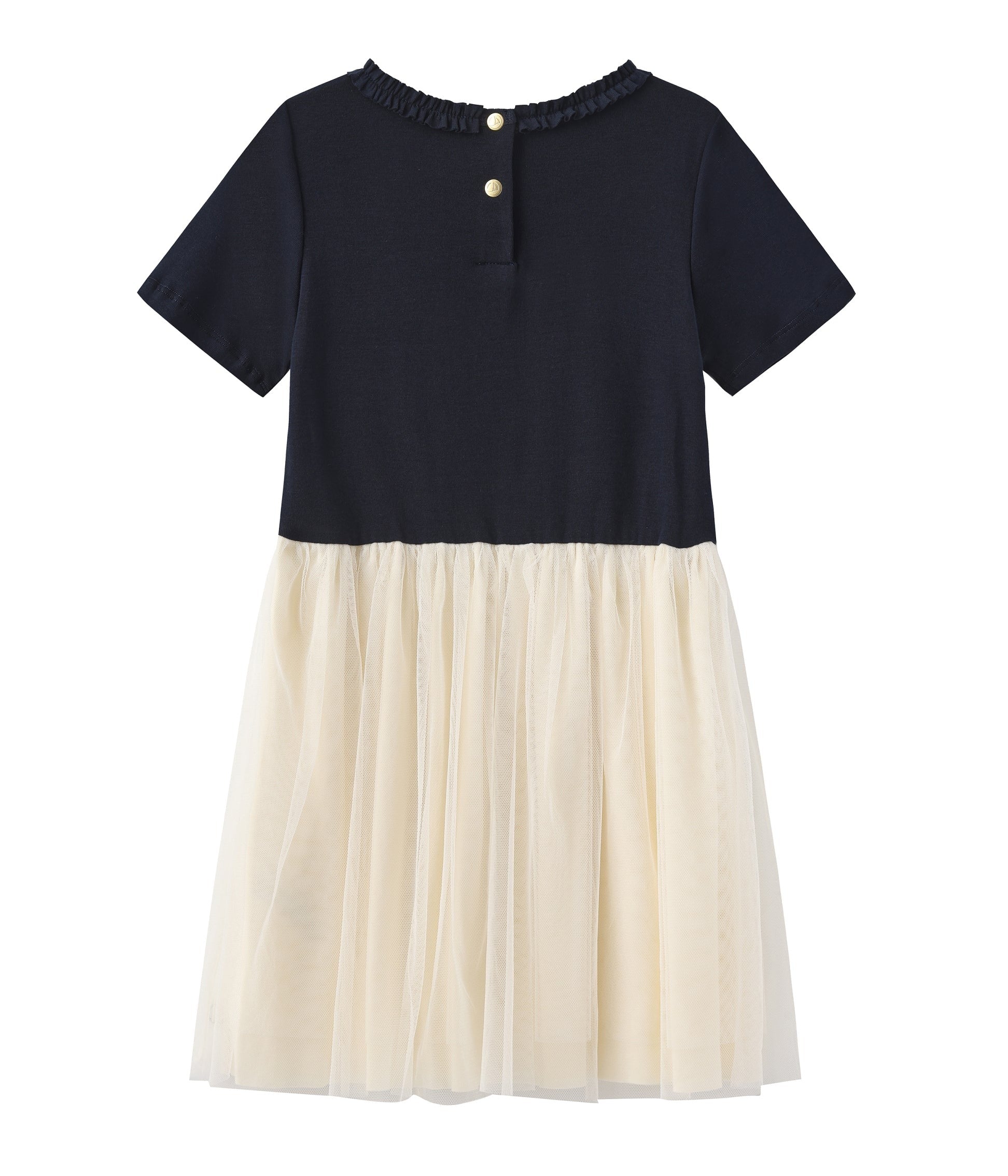 This dress features a contrasting design with a lightweight tulle skirt. The tucked neckline adds a stylish accent. Snap buttons on the back make dressing easy for energetic kids. This versatile piece is perfect for a wide range of occasions, from everyday wear to casual outings.
