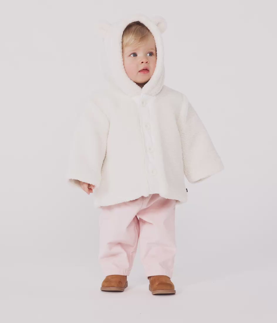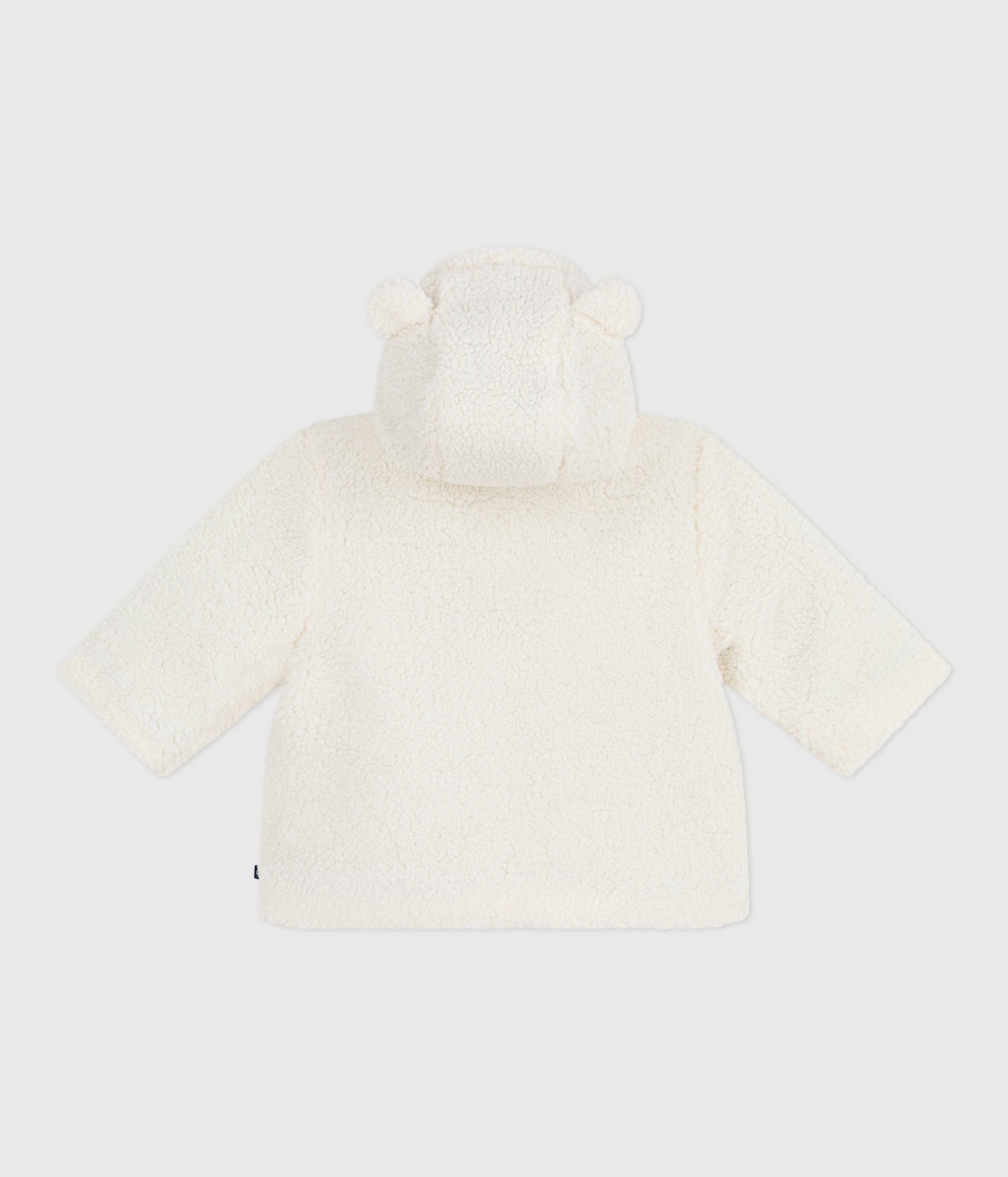- Girls' padded jacket in sherpa, a soft material with a shearling look.