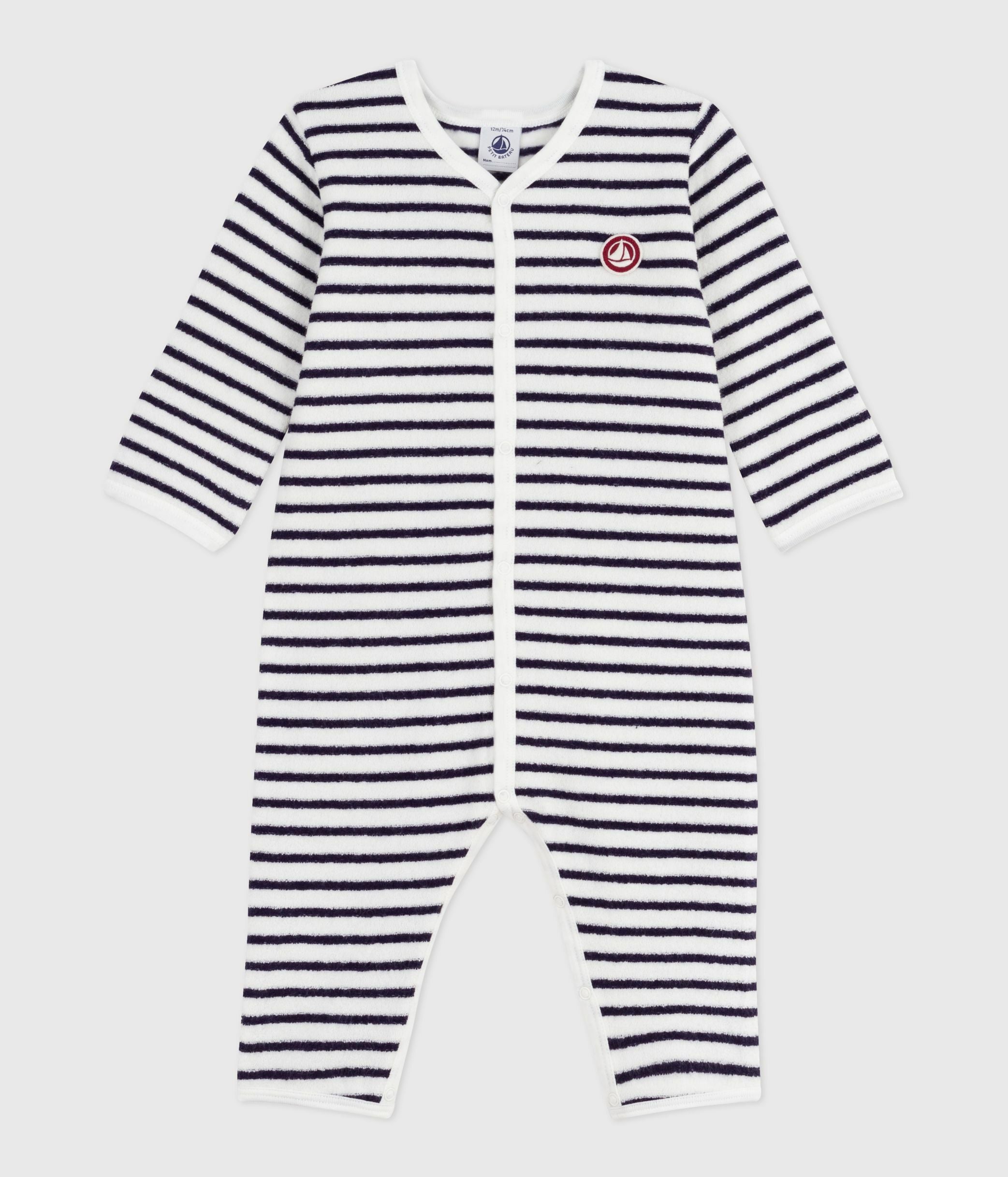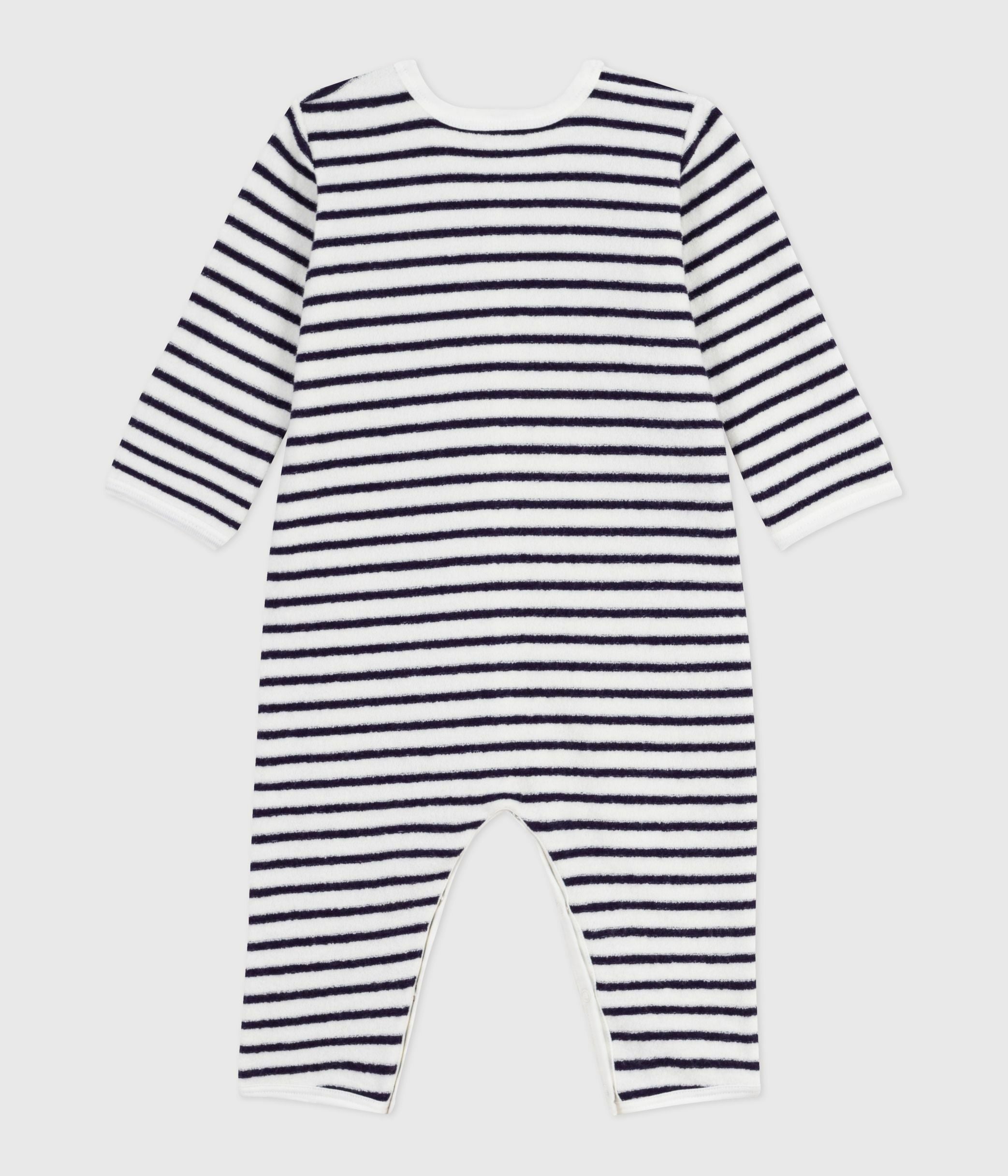 • The pyjama suit is opened and fastened with poppers at the front and between the legs.