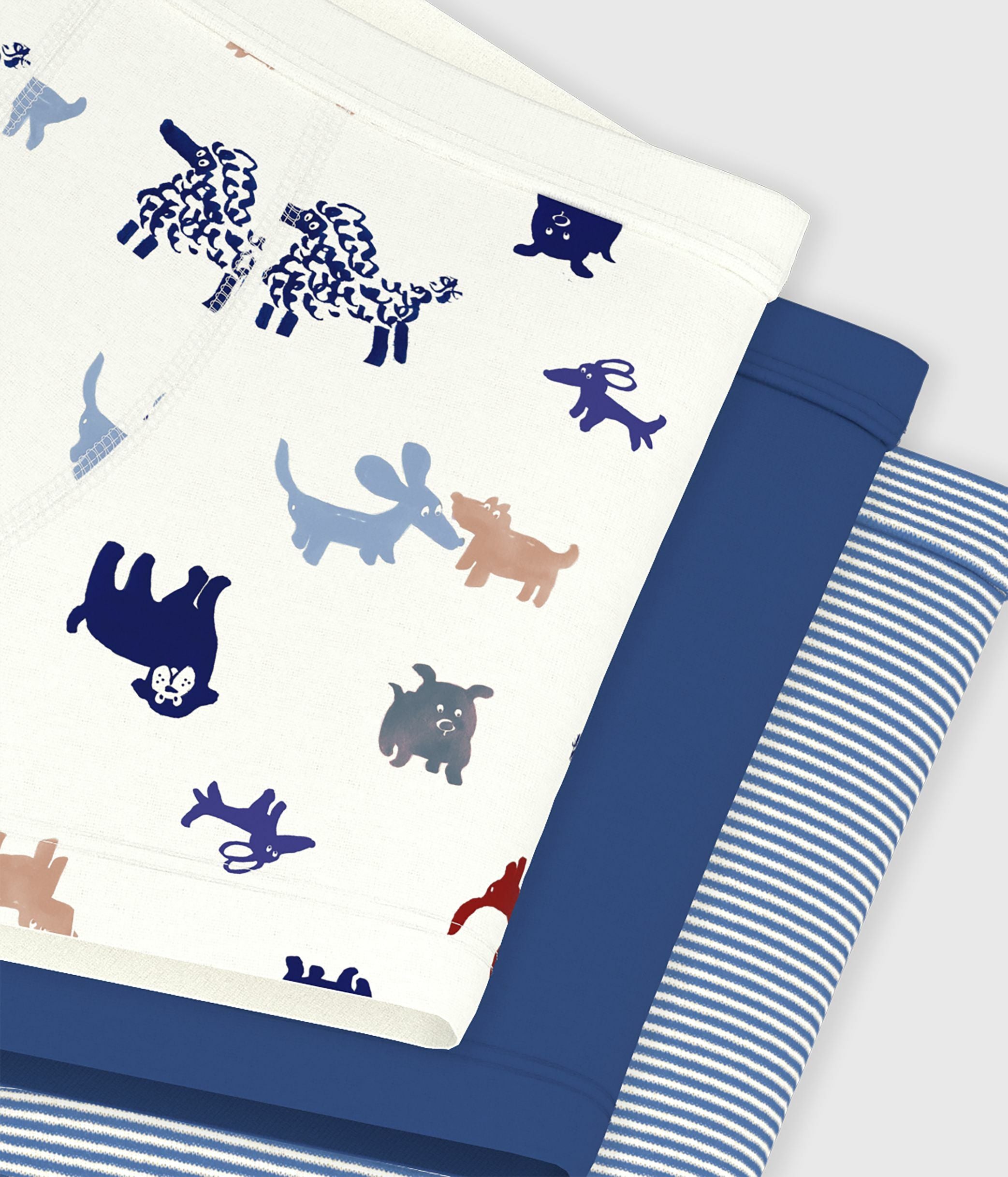 • This pack contains a pair of boxers in 1x1 rib knit with pinstripes, a pair of boxers in plain 1x1 rib knit and a pair of boxers with a dog print.