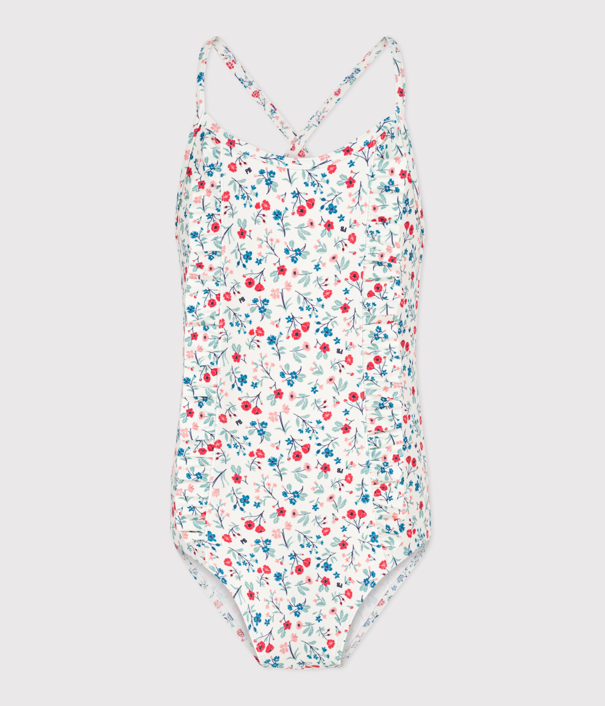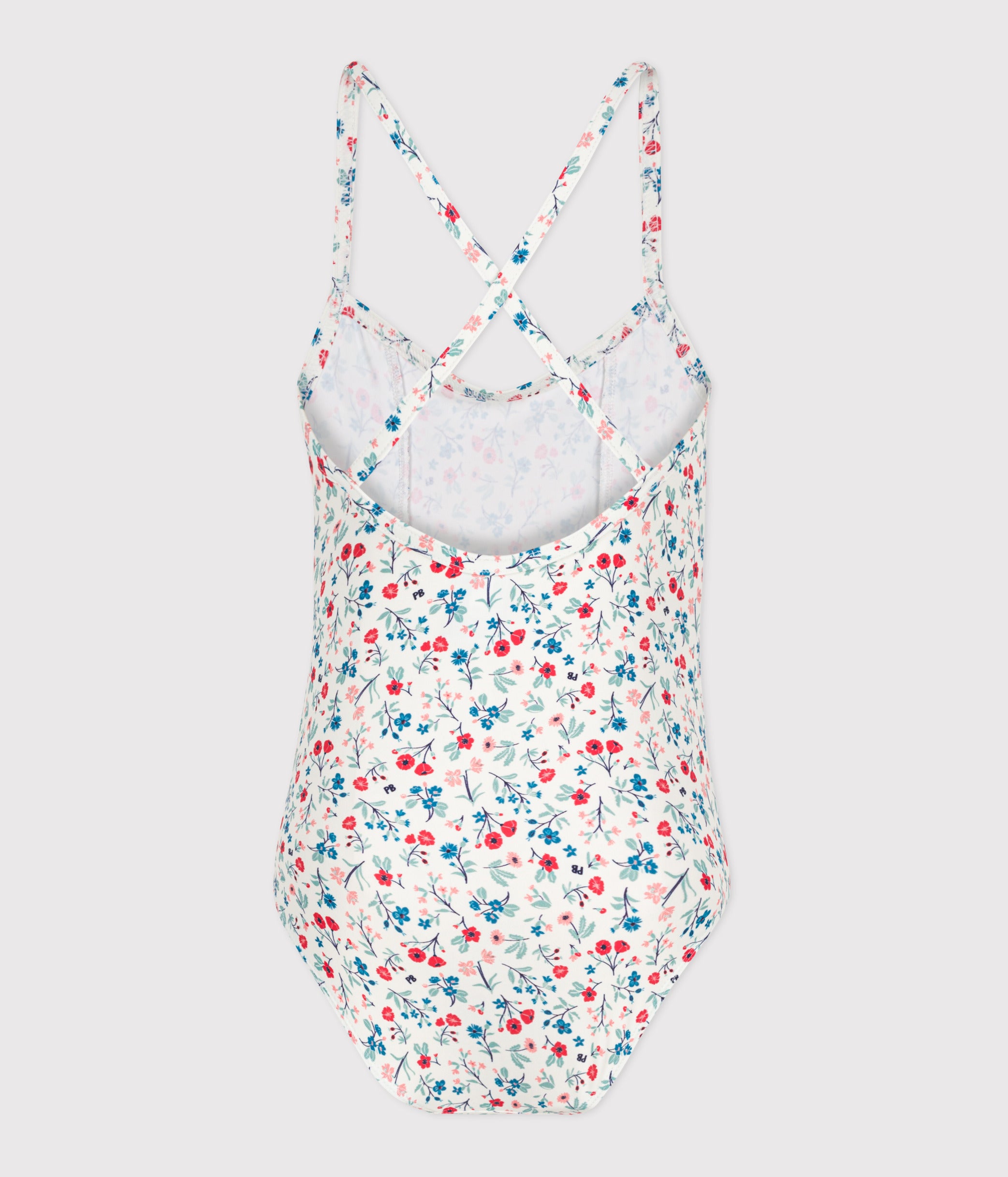 • A very feminine girls' one-piece swimsuit with ruffles and a floral print!