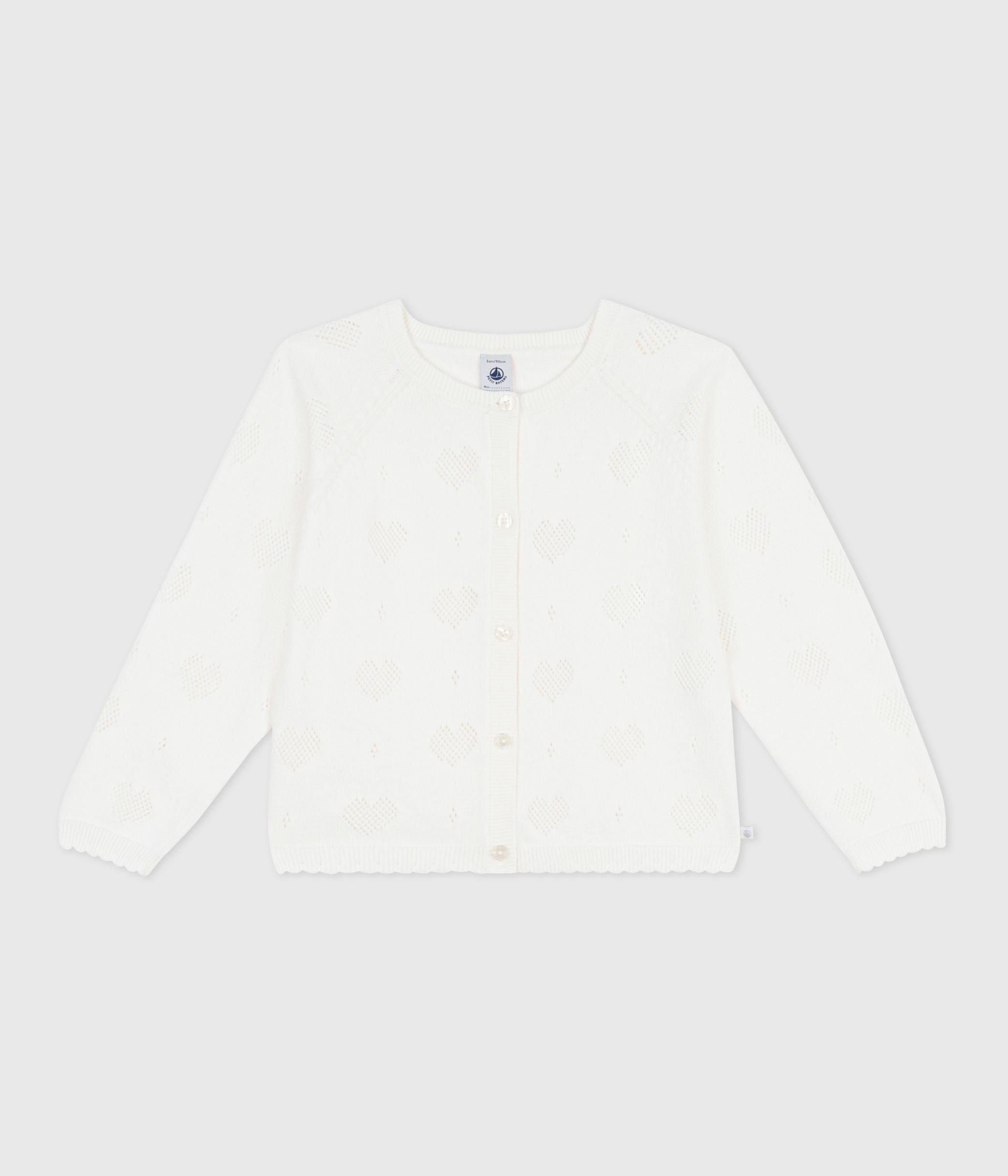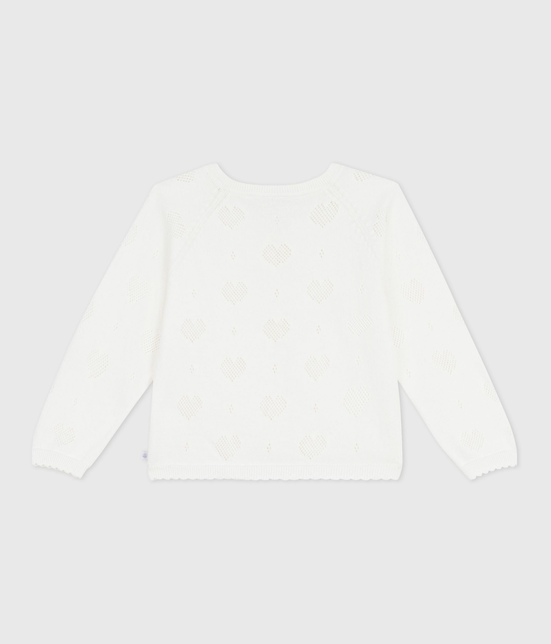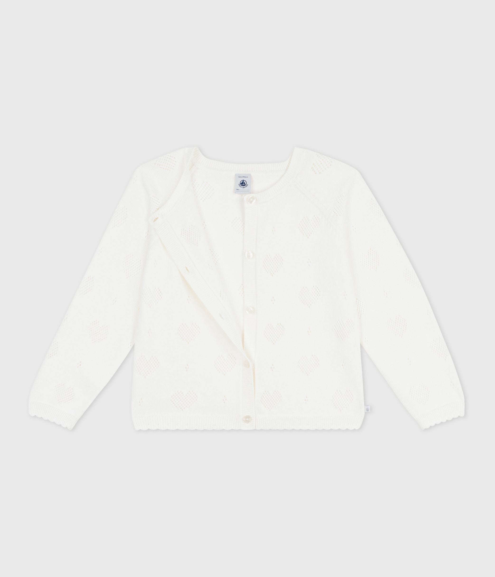 - Girl's 100% cotton knitted cardigan in an openwork stitch with a heart motif.