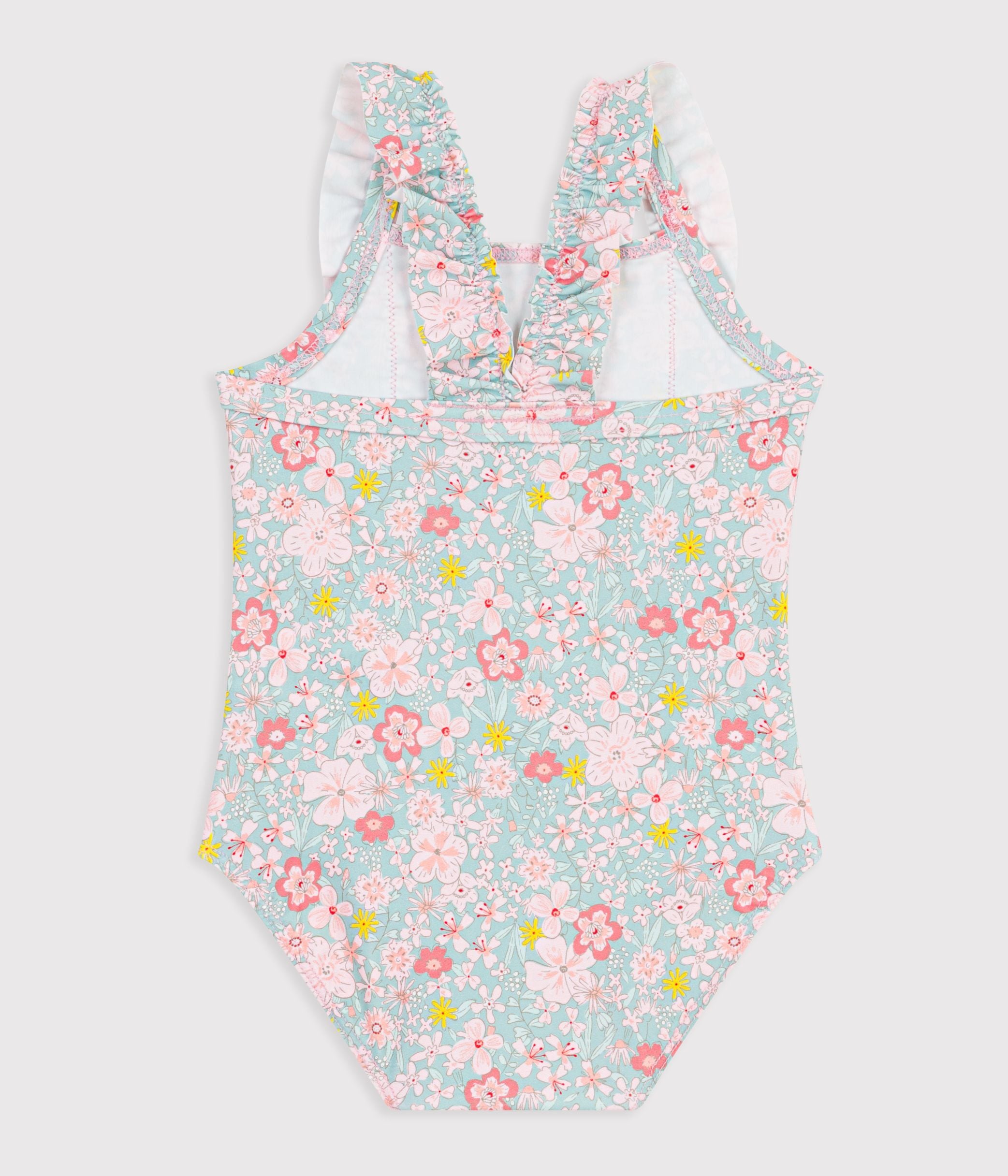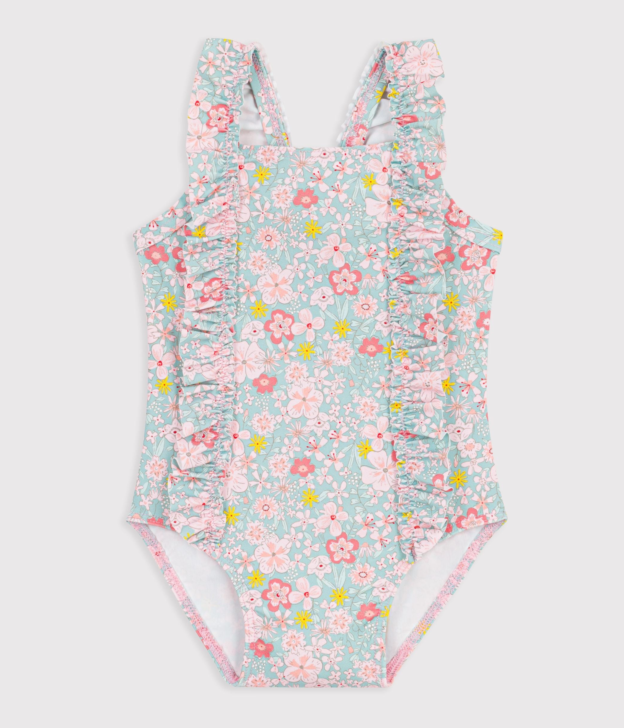 Babies' One-Piece Swimsuit with Ruffles and A Flower Print.