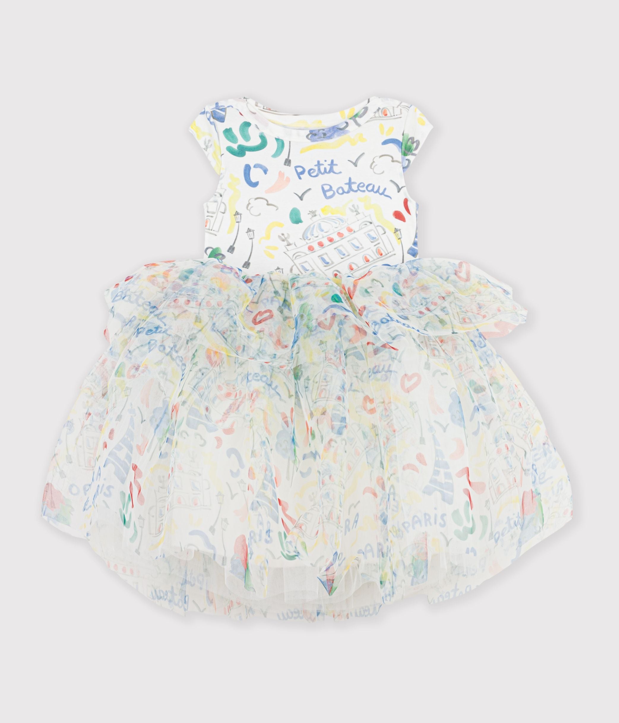 Dress in two fabrics, cotton and a tulle skirt.